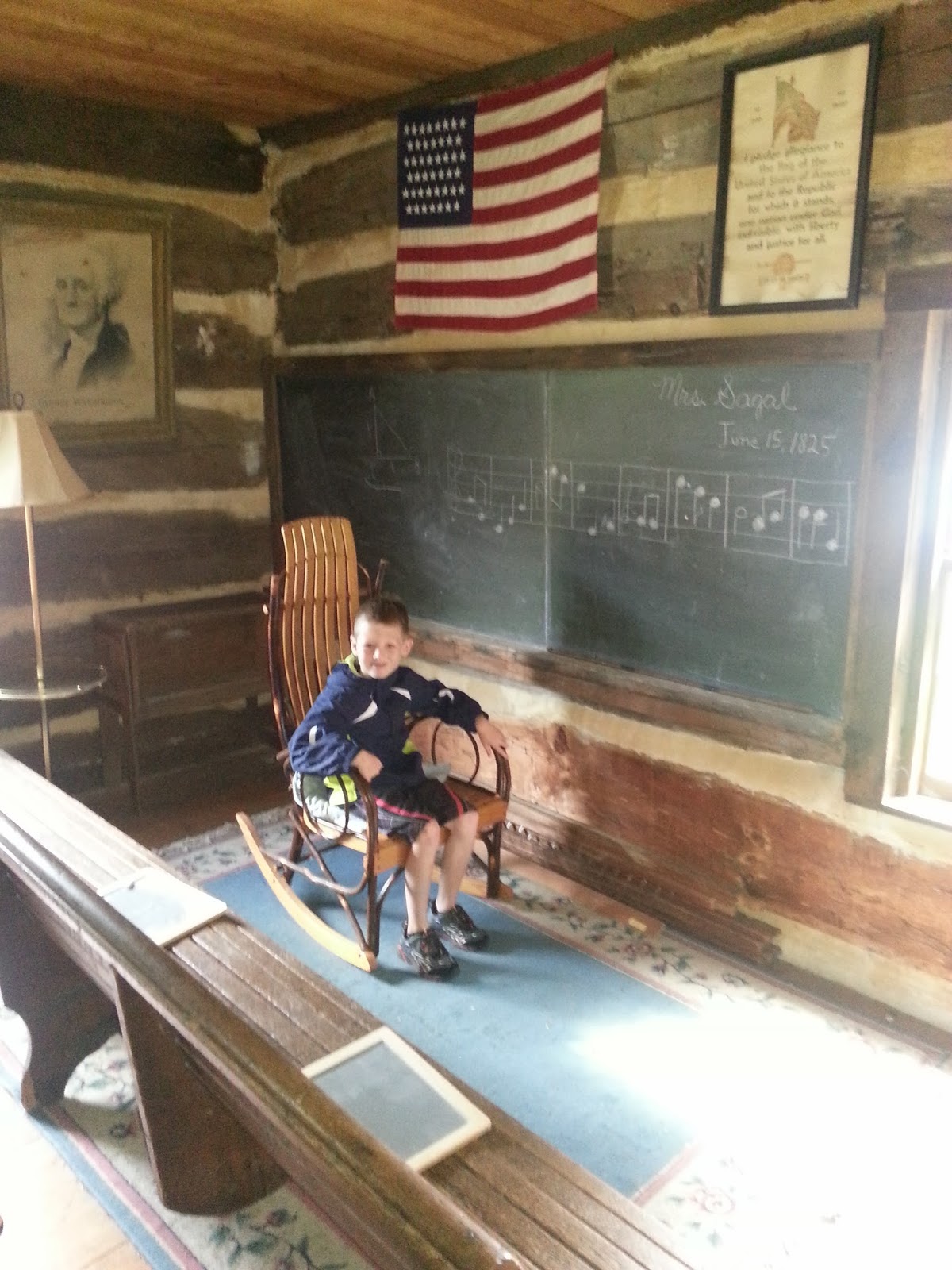 Another favorites of the boys was the one-room Compton School house. The school house was originally built on New Germany Road in Ca. 1810-1830 but, then was relocated to the Spruce Forest Village in 1989 and restored using a loan from Maryland Historical Trust. The boys loved playing with the props that were left out. They also loved looking at all the pictures of what the children looked like back then. Conner said he had wished his classroom was as cool as this one. ;)